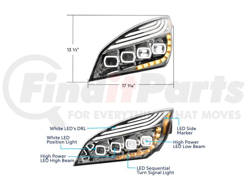 Headlight Assembly - Driver Side, Chrome, Quad-LED, with DRL and Sequential Signal