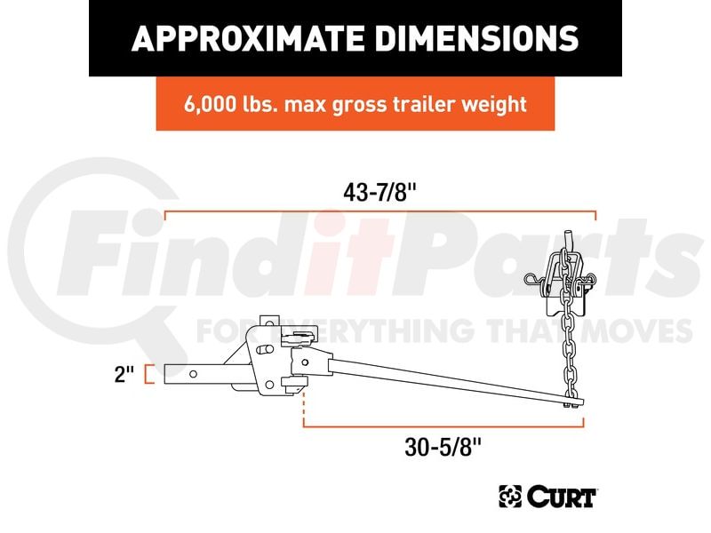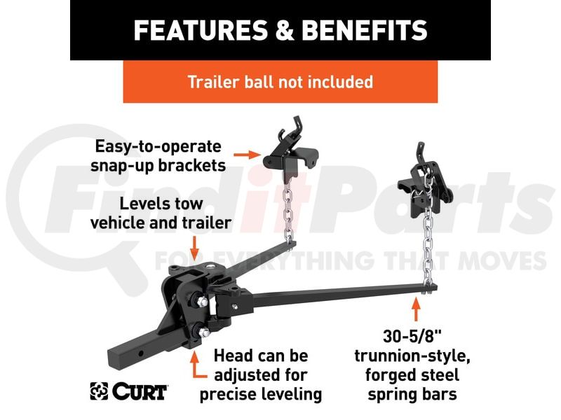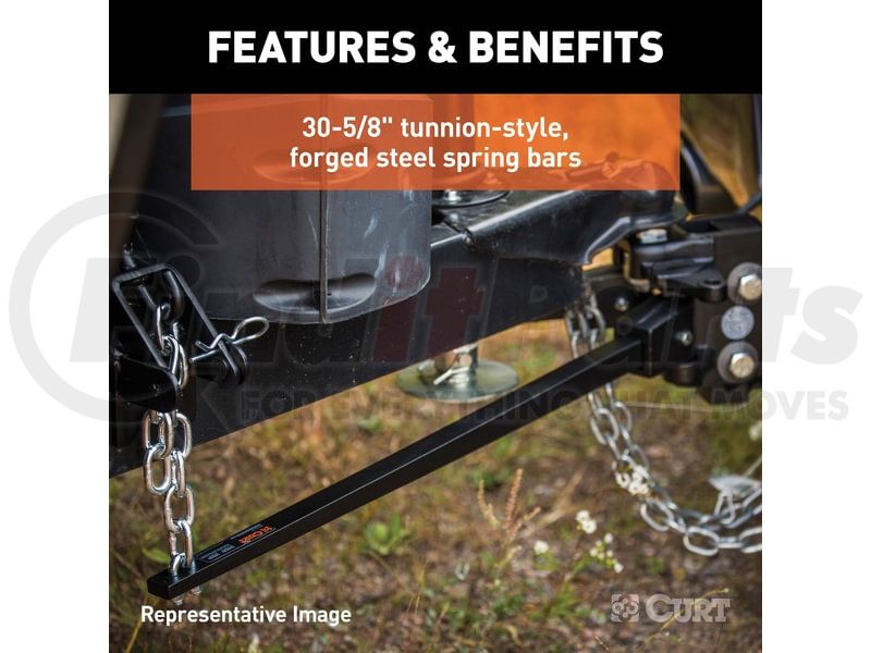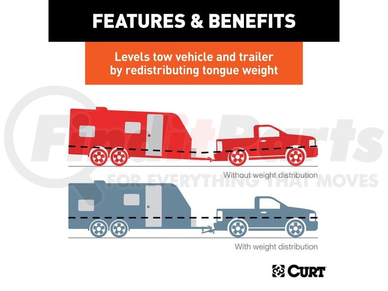 The CURT weight distribution hitch is a specialized towing system that provides improved vehicle and trailer control by leveling the trailer and more evenly distributing its tongue weight across the trailer's and vehicle's axles. Weight distribution hitches are commonly used on travel trailers and campers but can also be applied to other large loads.CURT WD hitches come with a 2" x 2" shank and are compatible with class 3, 4 and most 5 trailer hitches, including Xtra Duty and Commercial Duty (2 1/2" replacement WD shank may be required), as well as some RV trailer hitches. While a weight distribution hitch will increase the gross trailer weight capacity of most trailer hitches, the vehicle's weight carrying capacity must be taken into consideration before towing a heavier trailer (NOTE: Never exceed the lowest weight capacity of any towing component).This trunnion bar weight distribution hitch features a heavy-duty formed head and square spring bars constructed from forged steel. It offers a gross trailer weight capacity up to 6,000 lbs. and a tongue weight capacity of 600 lbs. It also includes hook-up brackets, spring bar safety chains and a pin and clip. To protect this hitch from scratching, chipping, rust and UV damage, it also comes with a durable black powder coat finish. A trailer ball must be purchased separately.
