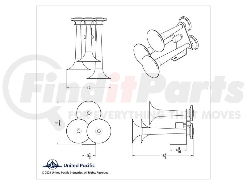 United Pacific 46129 - Horn - 3 Trumpet Style, Chrome, 12V, 150 psi, 145 dB +/- 10 dB.