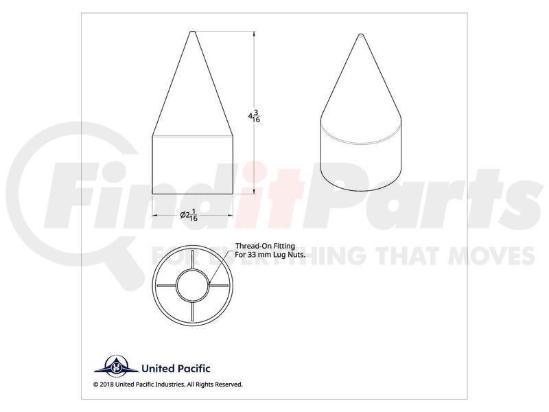 United Pacific 10000B - Wheel Lug Nut Cover - 33mm x 4 1/8", Black, Spike, Thread-On